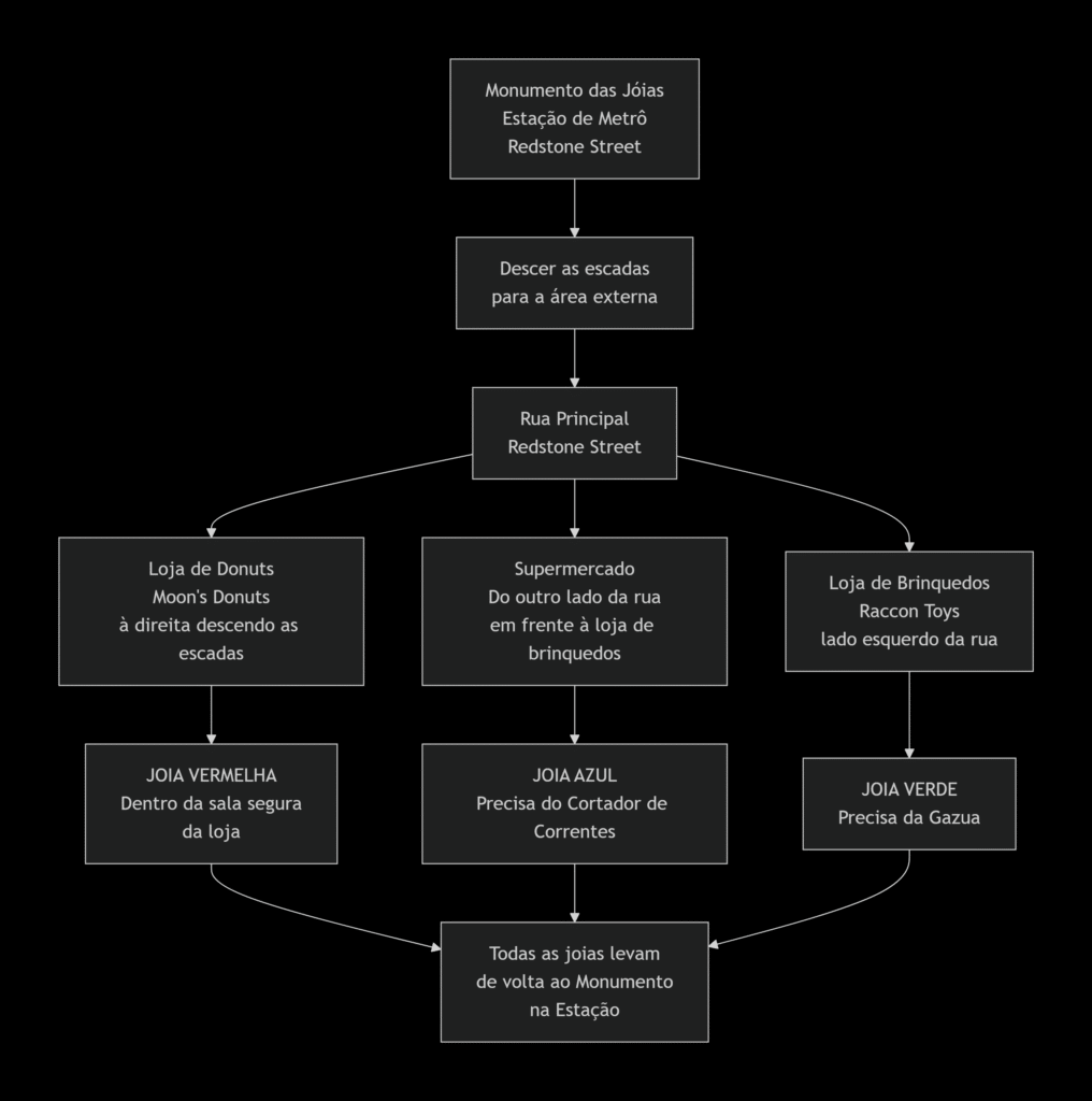 Para sua referência, o mapa abaixo mostra a disposição das lojas na rua principal (Redstone Street), o que ajudará a visualizar a localização de cada joia.